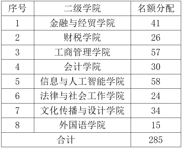 2025年学院国家励志奖学金名额为285名。根据2024-2025学年各二级学院学生资助对象的人数计算名额分配,现将名额分配如下: