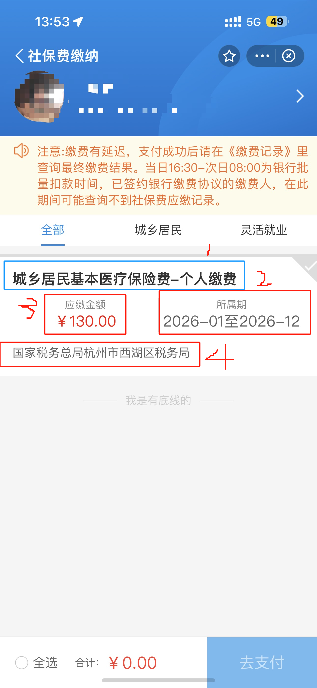 缴费前请仔细核对缴费地区(西湖区税务)、应缴金额、所属期和缴费类型,核对无误之后再点击“去支付”,显示缴费成功即可于2026年1月1日享受2026年度大学生医保相关待遇;参保失败的同学请按通知填写失败原因,进行后续的处理。