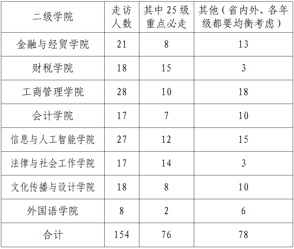 除2025级重点资助对象必须走访外,二级学院可考虑单亲、残疾、烈士子女等其他资助对象,具体分配如下: